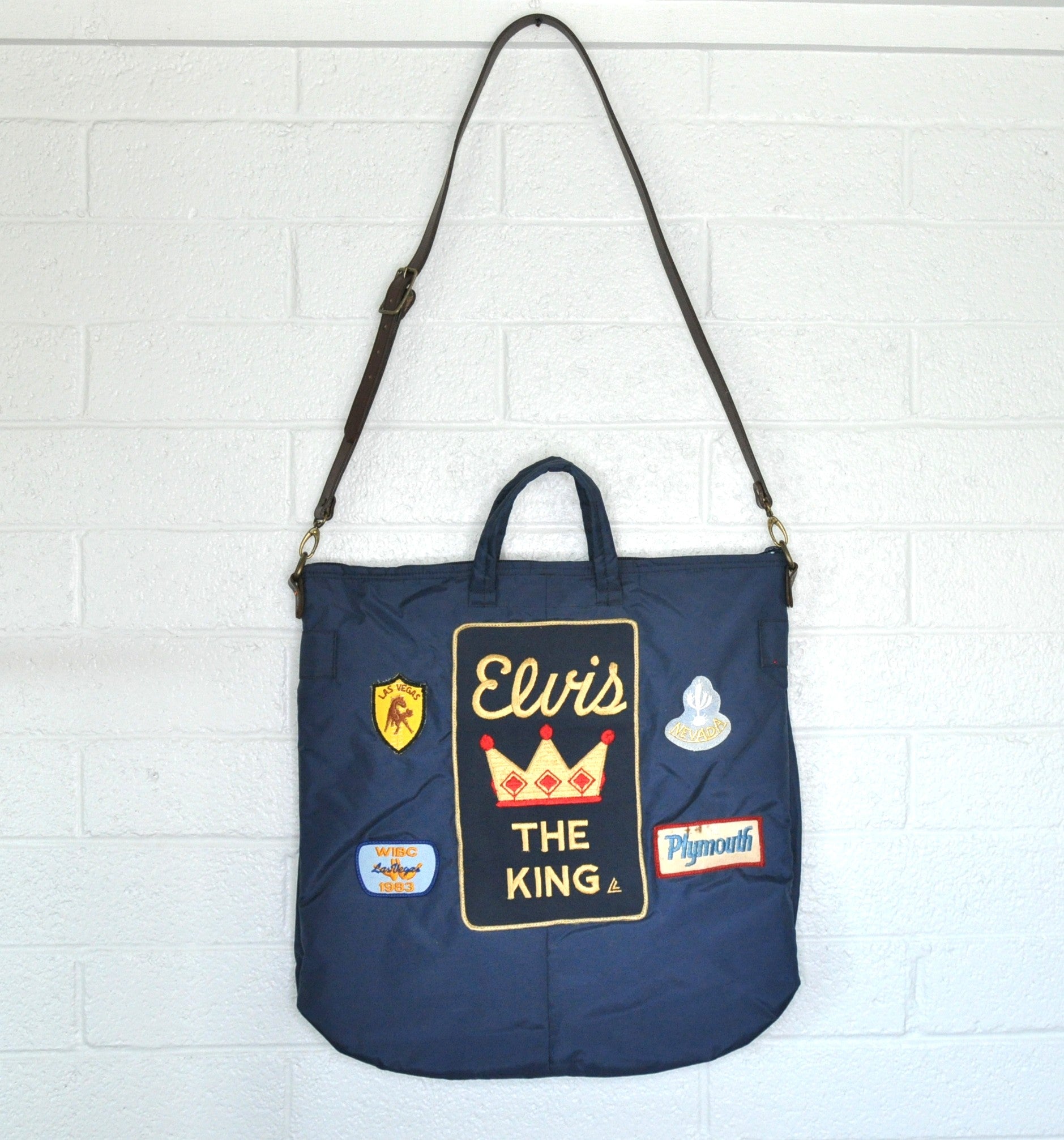 One of a kind Elvis Flyers helmet bag (new) with Vintage patches. Elvis did drive a Plymouth as a Teen. leather shoulder/ copper riveted crossbody strap. 2 outer pockets and 2 inner pockets. 19x19.