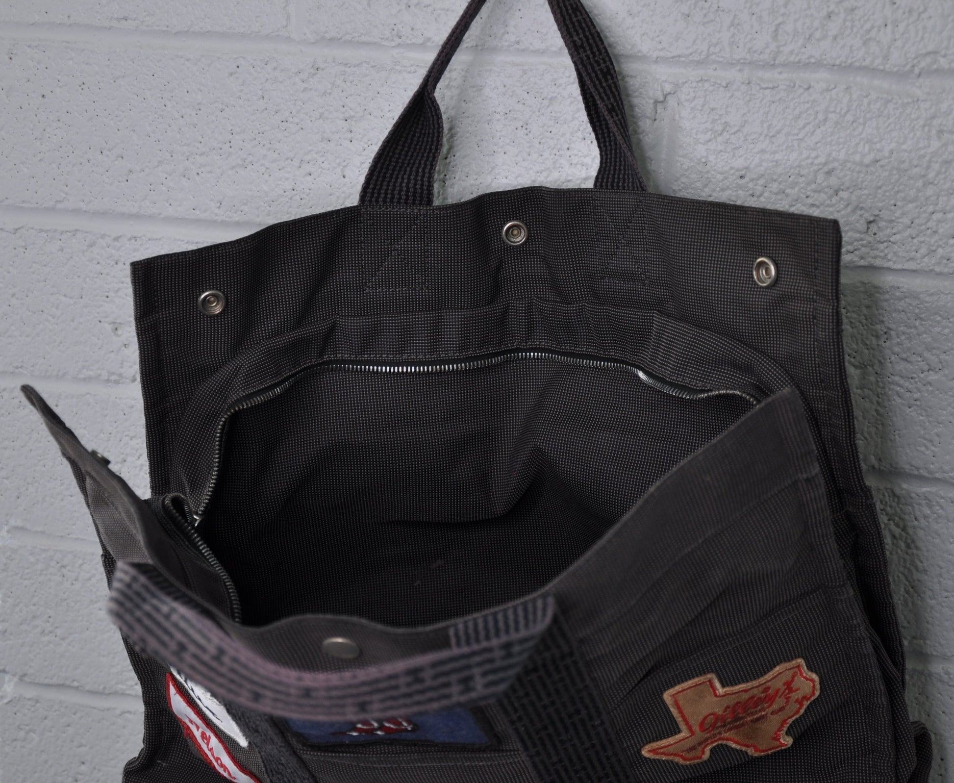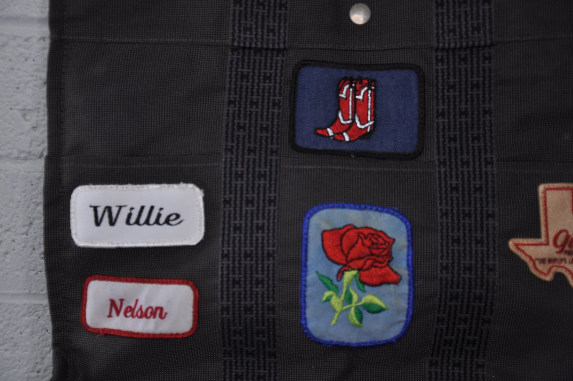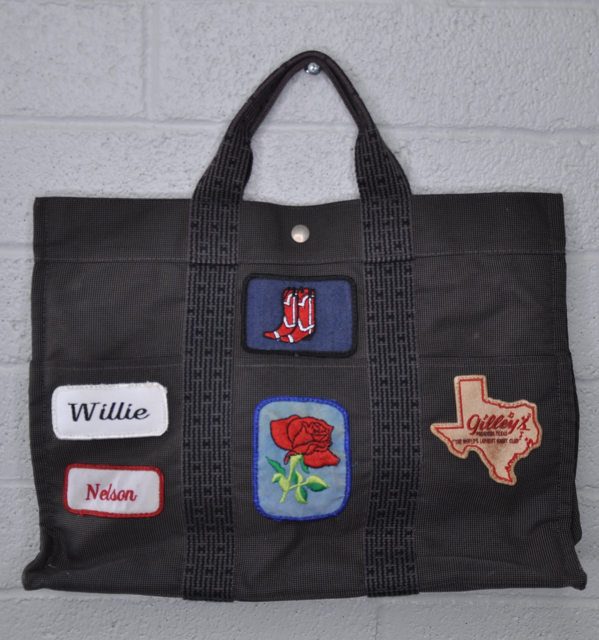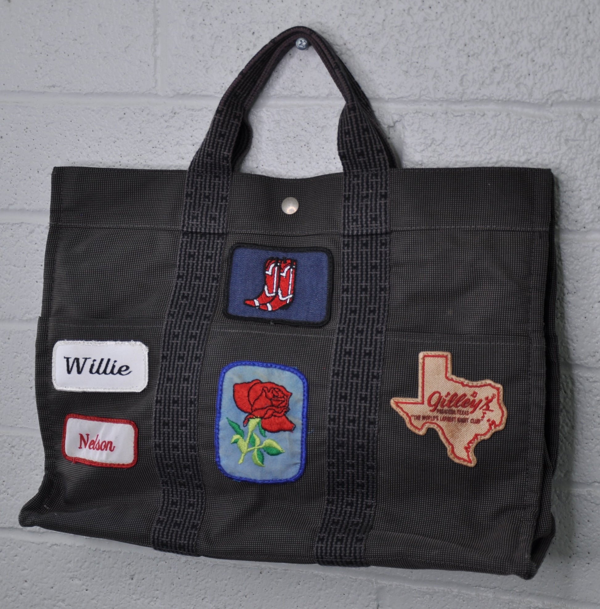 Paris meet Texas in this one of a kind Vintage Hermes bag. Great shape, this is the Hermes Herline mm grey canvas tote. W 16.5 x H 12.2 x D 4.7 One inside open pocket and 6 outside open pockets. We thought a vintage Gilleys and Willie patch could make this bag Cowboy Chic. Bag is in Great shape and is authentic.