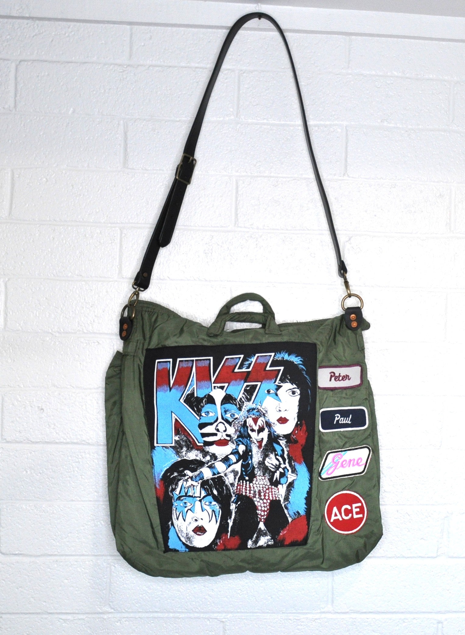 One of a kind Kiss Vintage flyers bag. All vintage patches. Large Vintage Kiss backpatch, that would go on Jean Jacket in the 70's -90's. Also each name of band members represented with vintage patches. Leather Cross body strap. 2 interior pockets and 2 external pockets. A one of a kind Kiss bag.