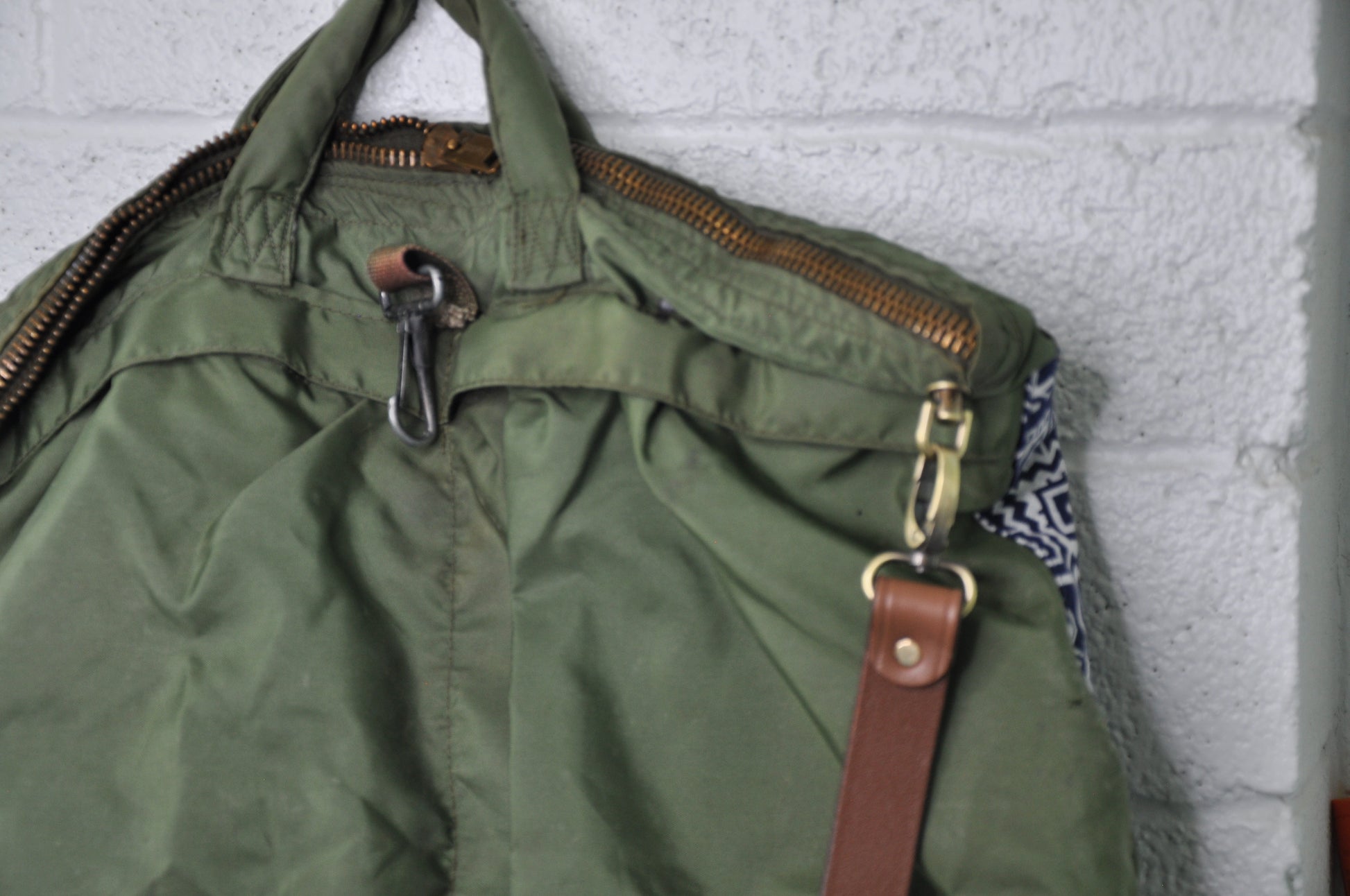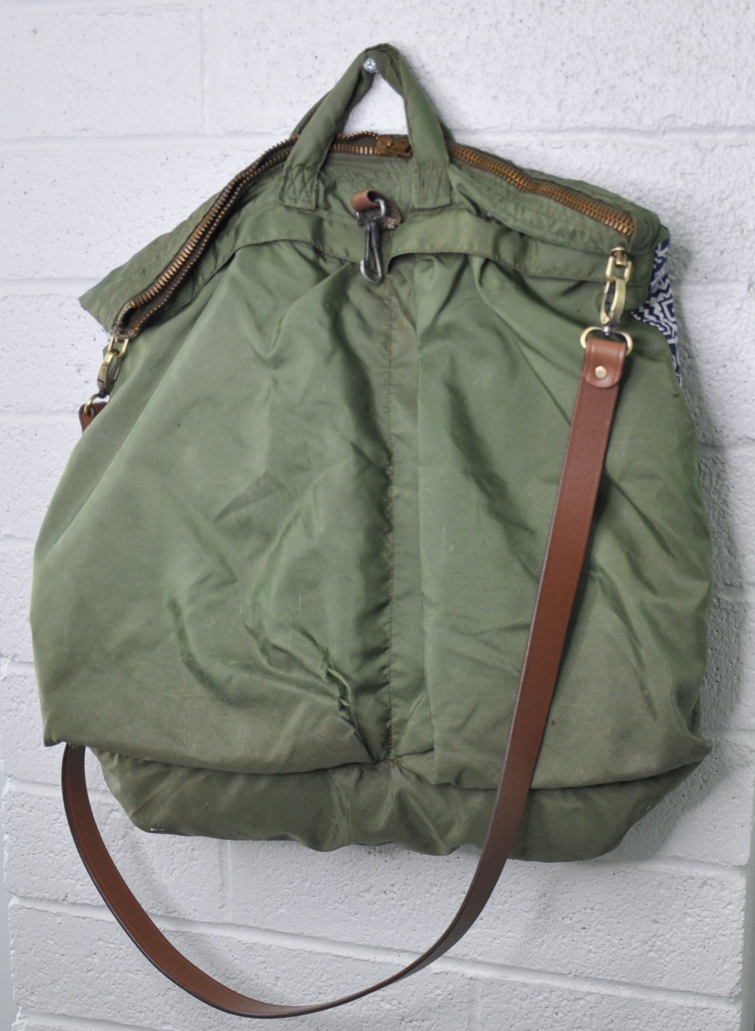 One of a kind Vintage Flyer helmet bag. With Vintage 1984 Wille Nelson back stage patch. Chain stitched Willie on Bandana. 19x19 bag dimensions, Leather cross body strap, 2 outer pockets and 2 inner pockets. This bag is Vintage, we have repurposed this bag and brought new life to it, so there will be marks and patina.